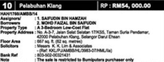 | Residential | Unknown/ Not Available | Port Klang | Selangor | 24/06/2014 | 36,450 |